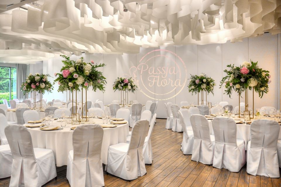 Heksagonalna ścianka z kwiatami i neonem - idealna dekoracja miejsca młodej pary.