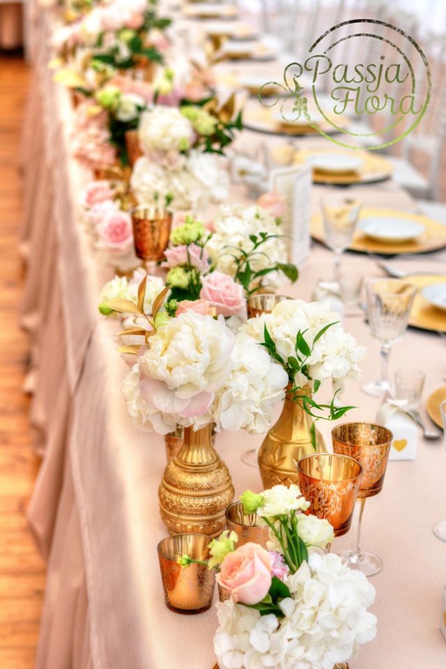 Złoto-różowe obrusy, różowe serwetki, złote podtalerze.
