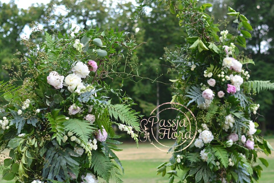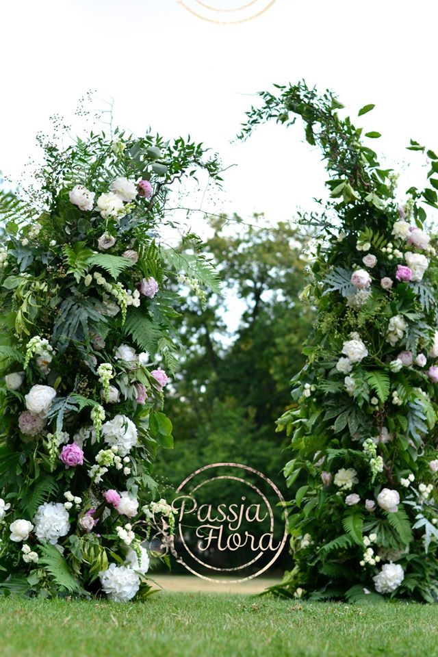 Ślub plenerowy w ogrodzie. Kwiatowe filary, białe krzesła, płatki, kwiatowe wianki, świeczniki na stołach gości.