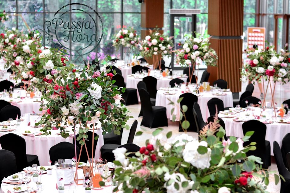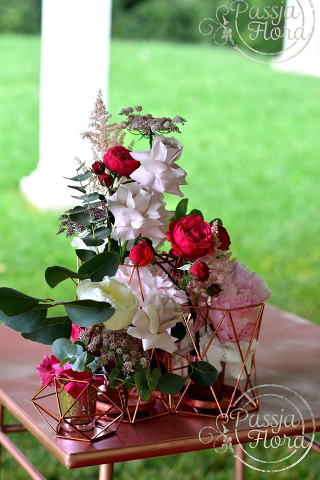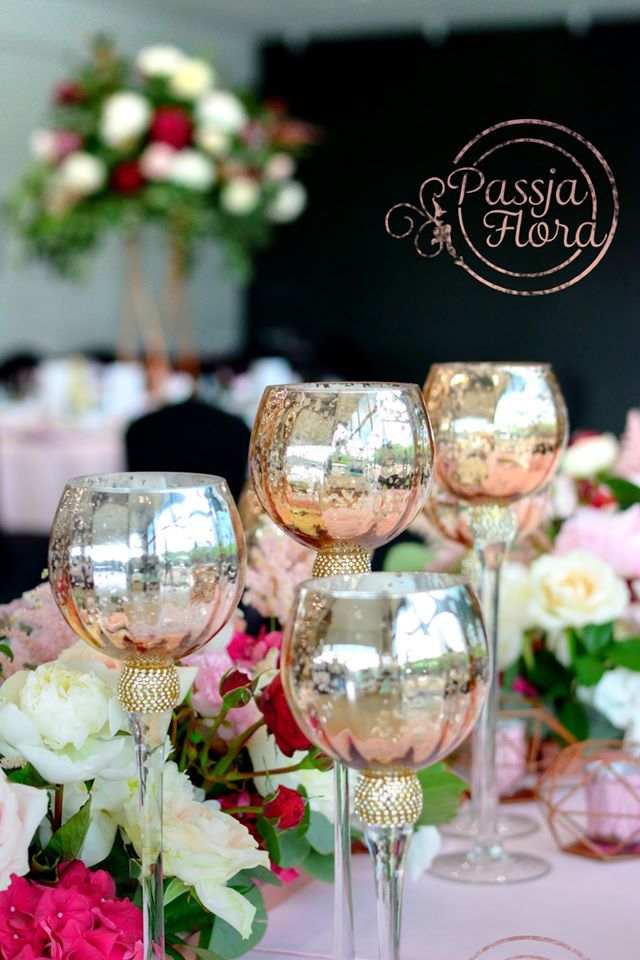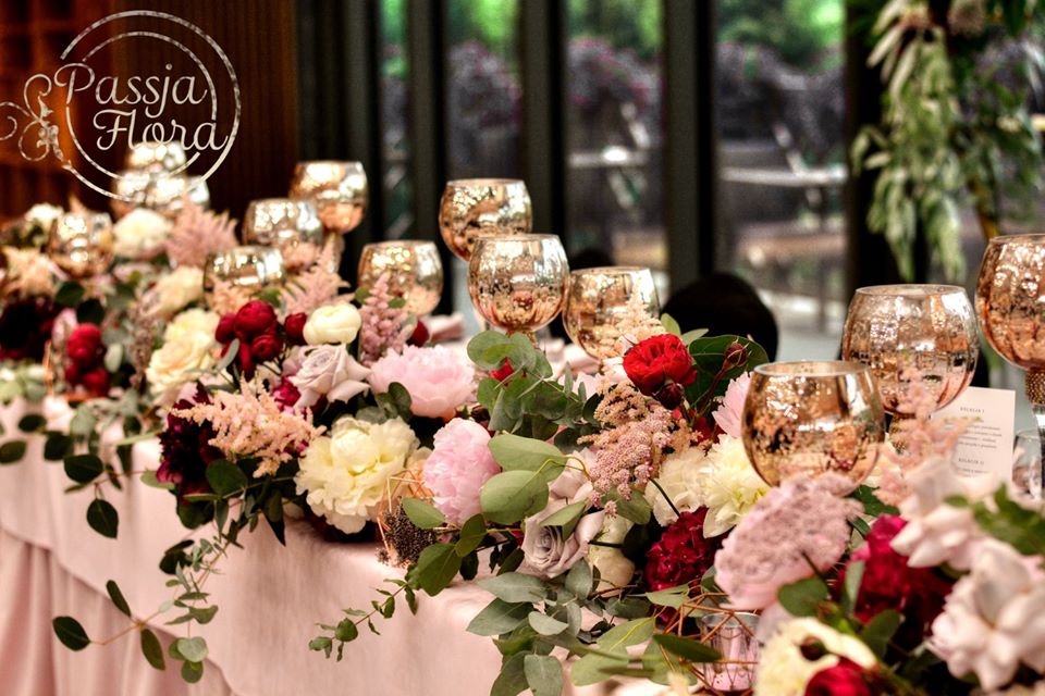 Za parą młodą kwiatowy heksagon. Na stole młodej pary miedziane, szklane kielichy na świece.