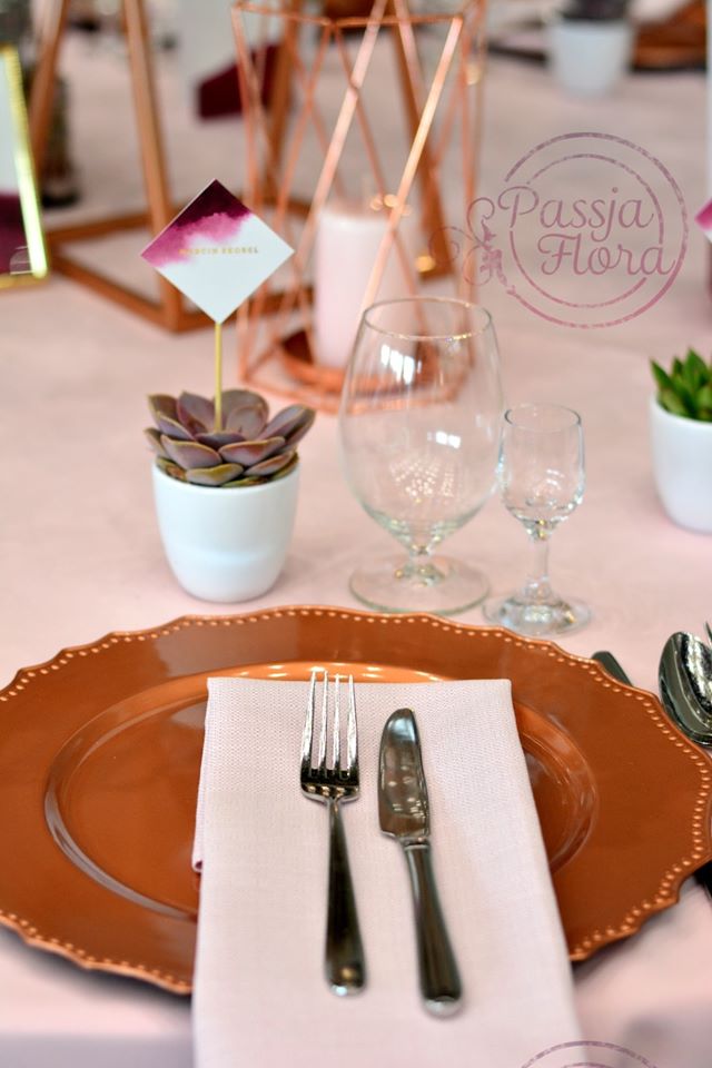 Miedziane podtalerze i serwetki w zgaszonym różu, a do tego miniaturowe sukulenty z winietką.