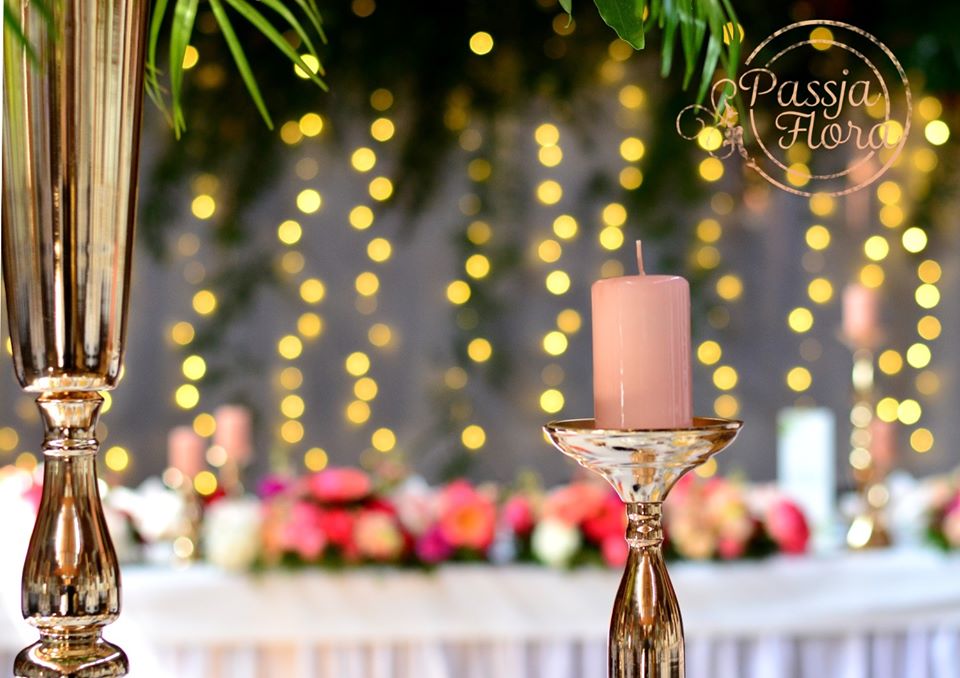 Kompozycje w złotych, eleganckich flakonach i łososiowe świece zdobią klmatyczne wnętrze.