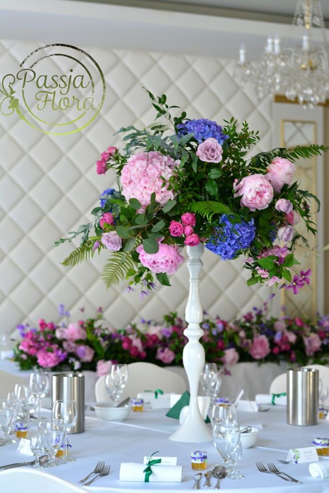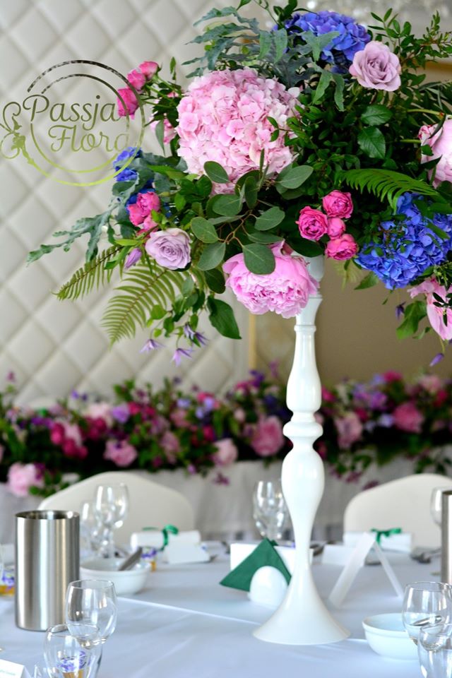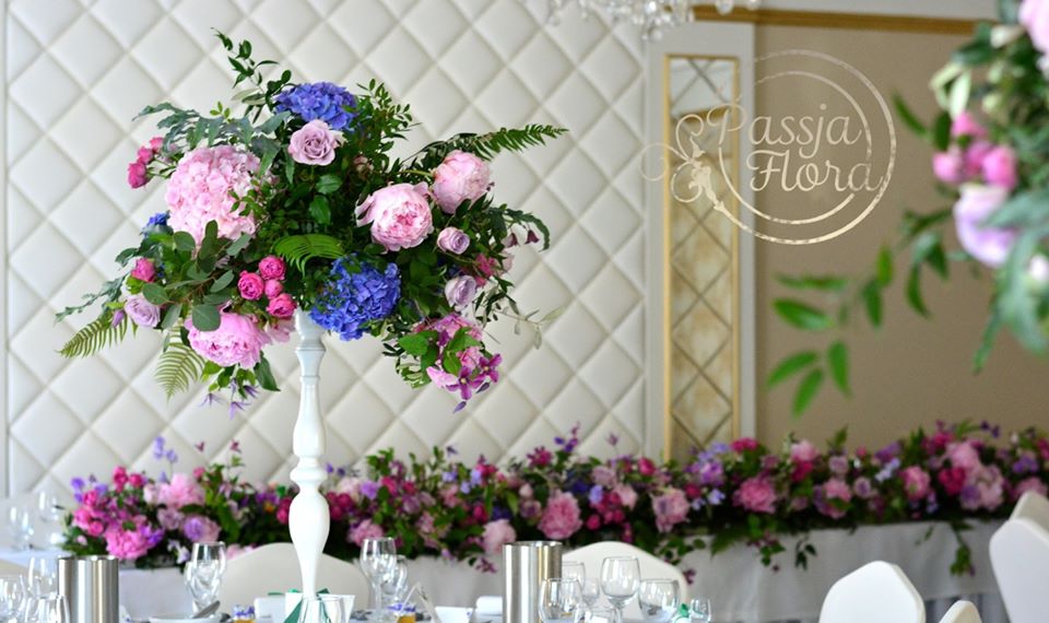 Kompozycje kwiatowe na wysokich białych stojakach.