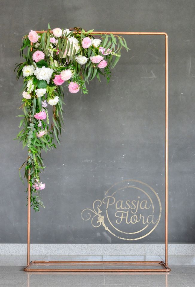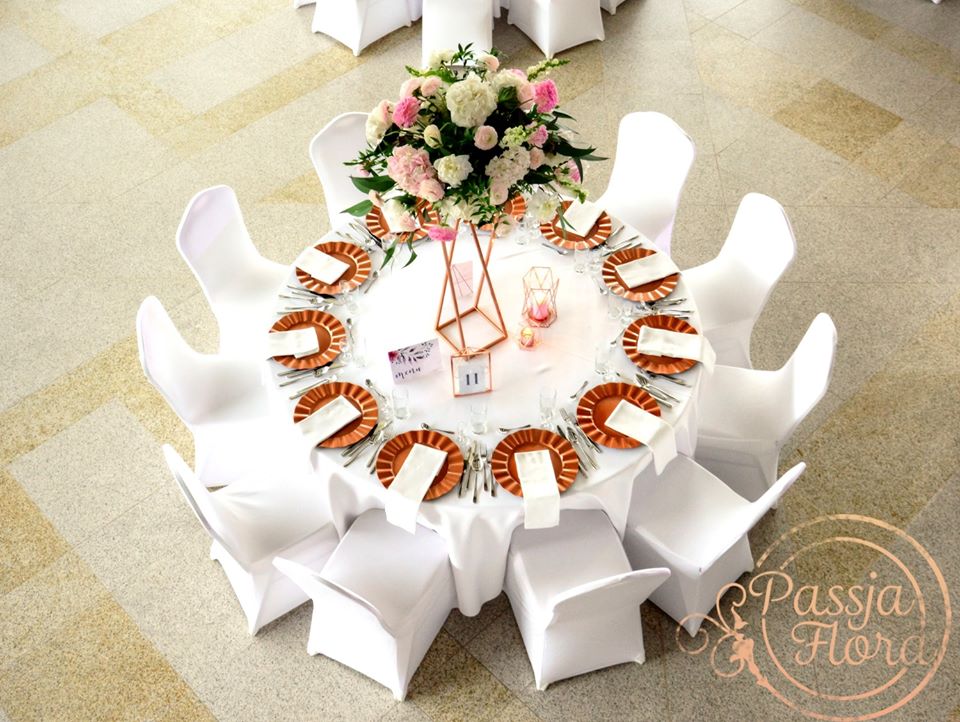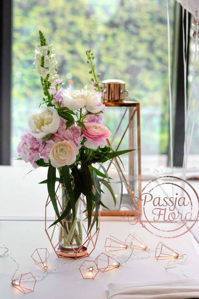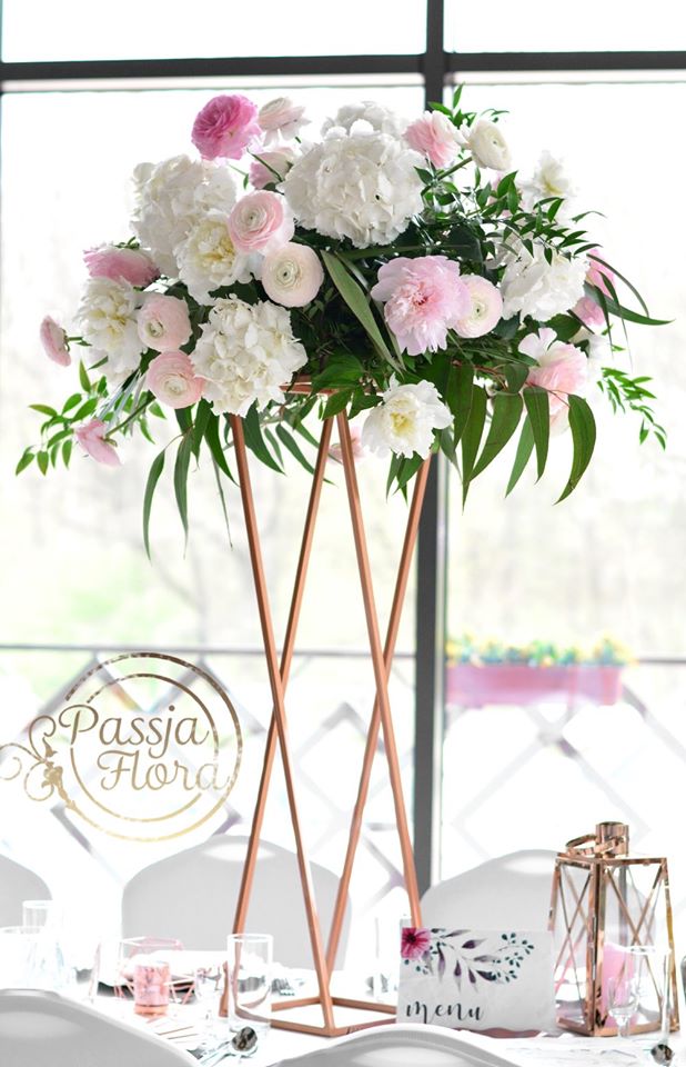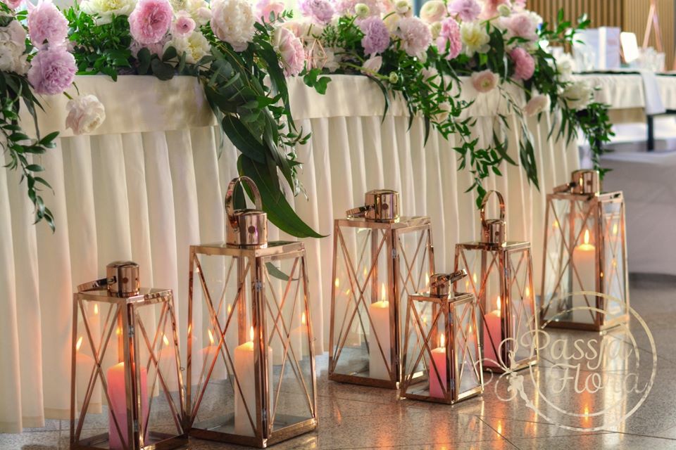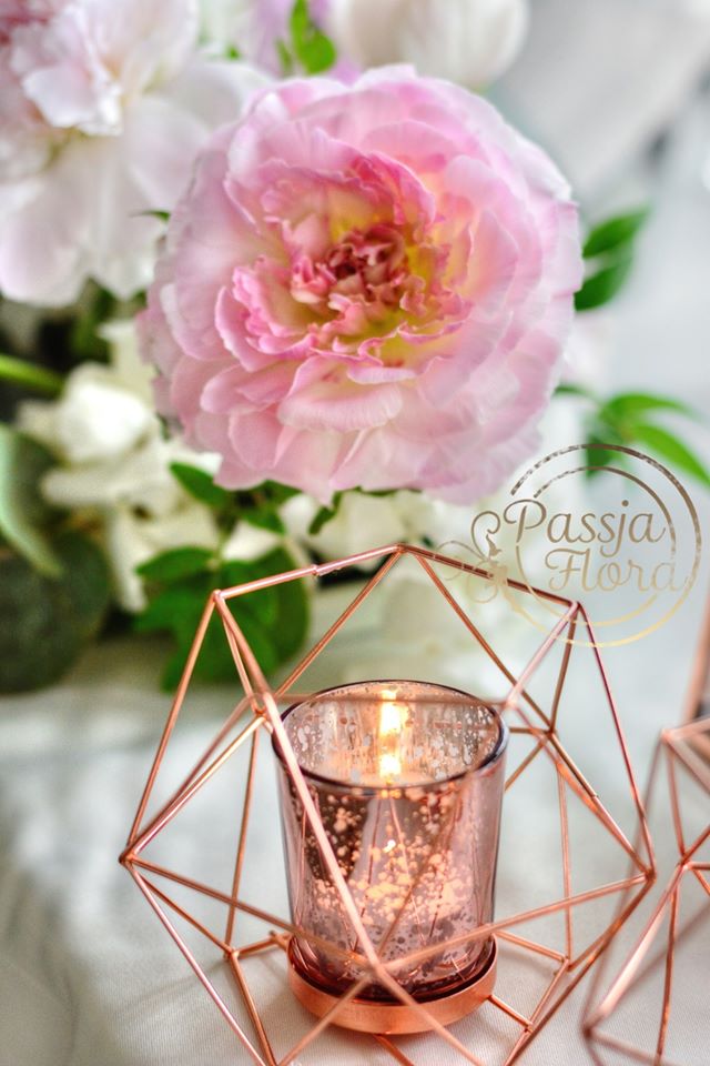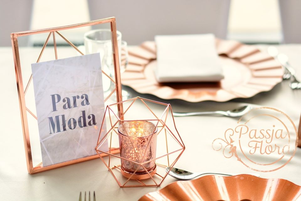 Geometryczne stojaki, świeczniki, lampiony, balony z helem, a wszystko to w modnym kolorze golden rose.