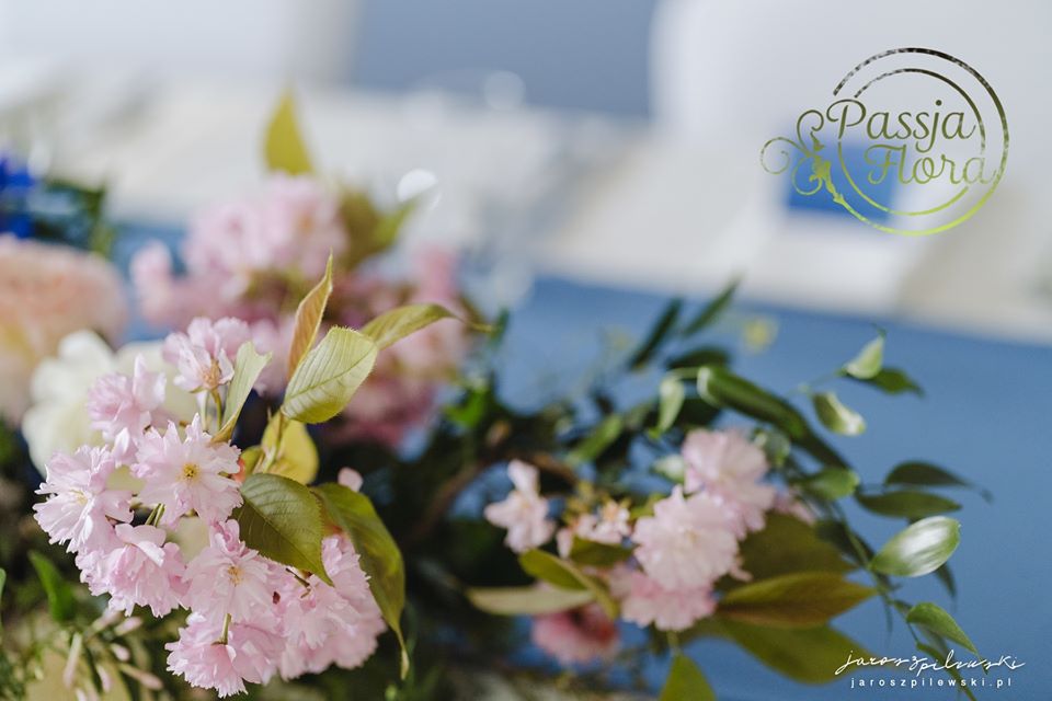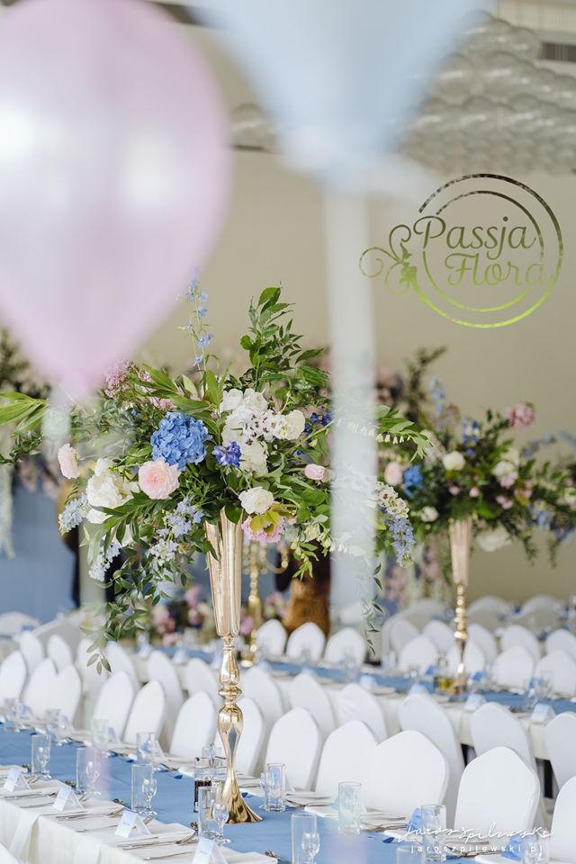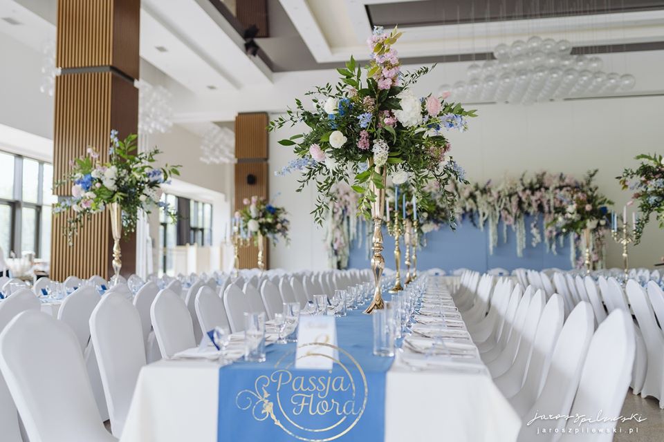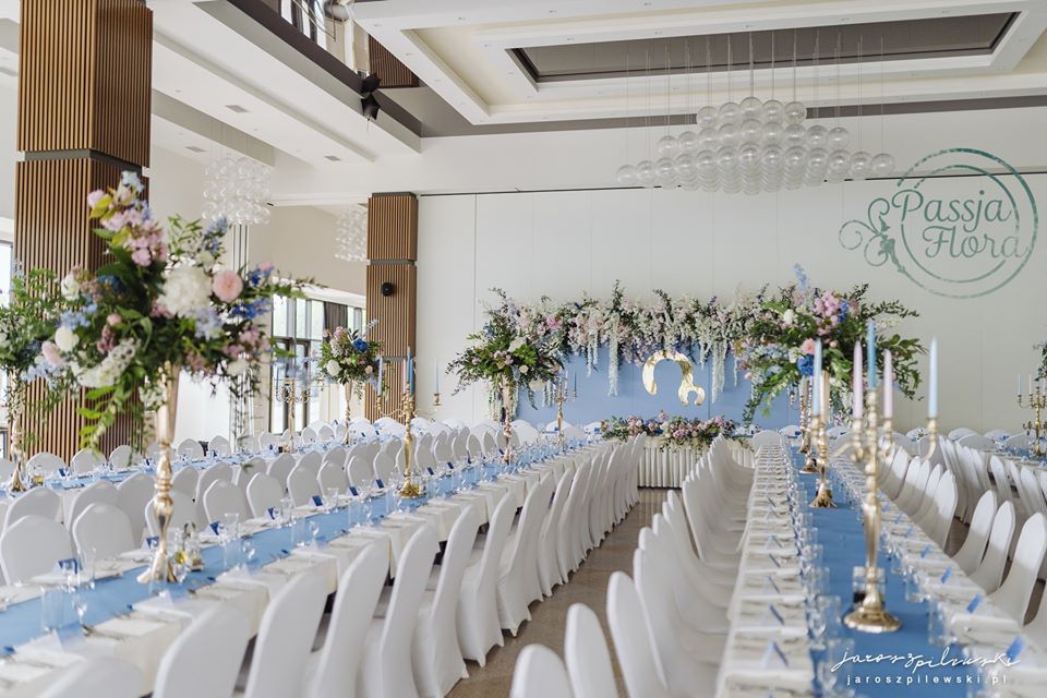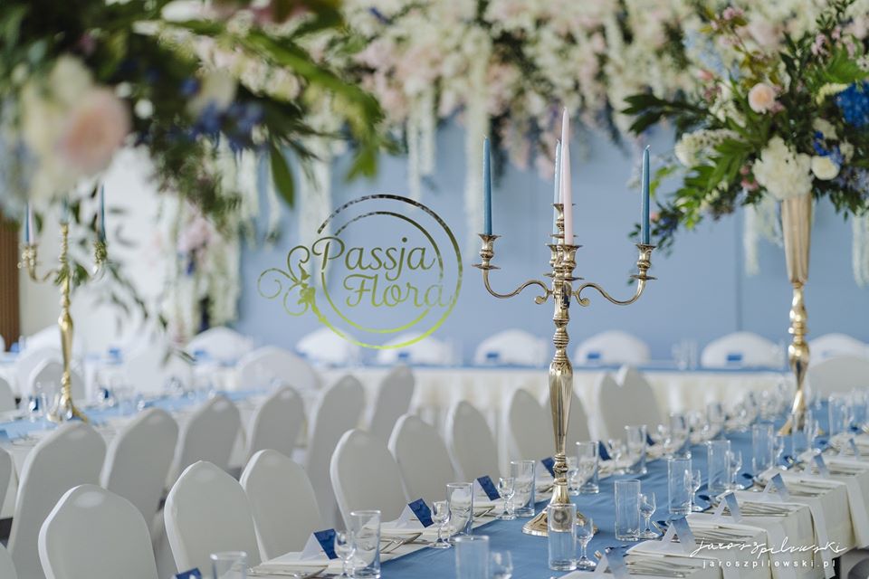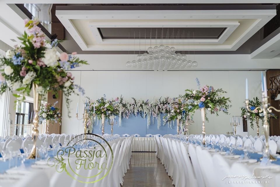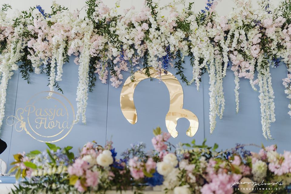 Lekko muśnięte różem. Lazurowe obrusy, złote flakony i kandelabry i ogromna ścianka pełna kwiatów z symboliczną aureolą Matki Bożej.