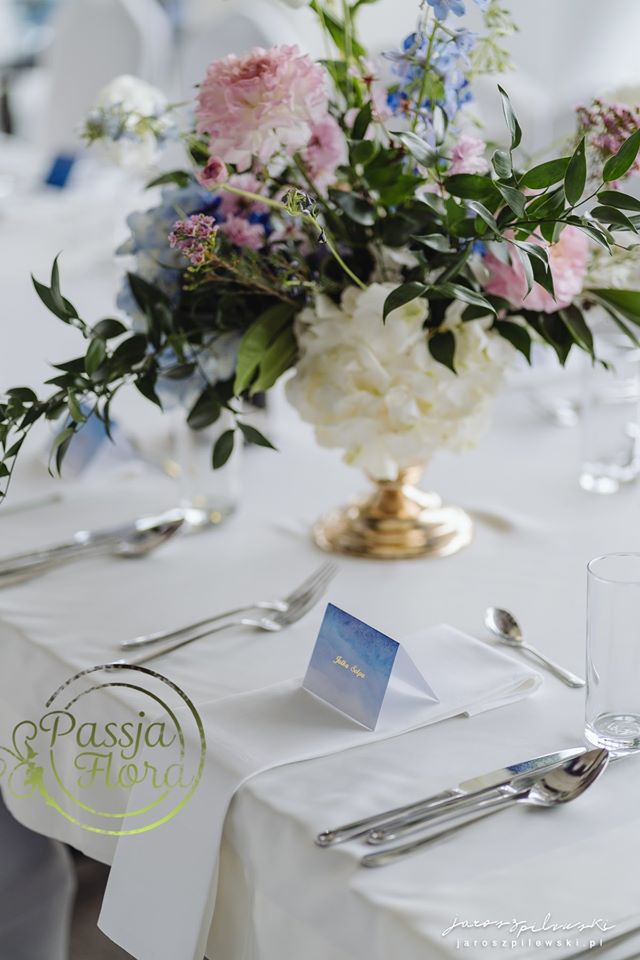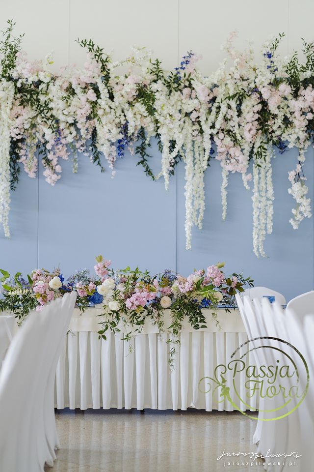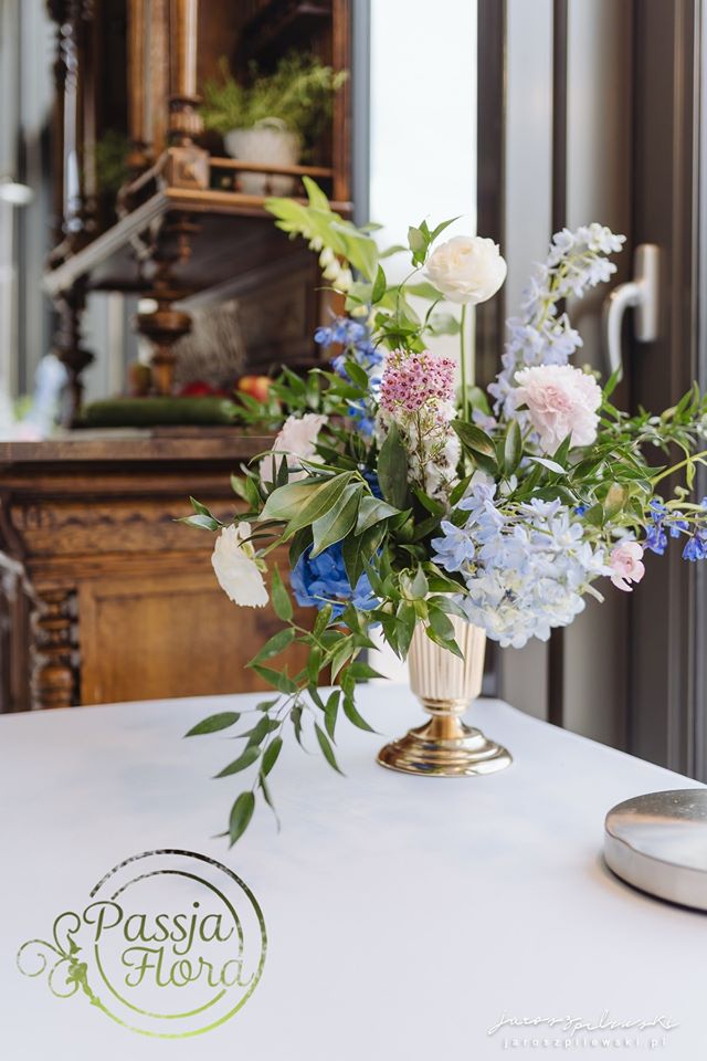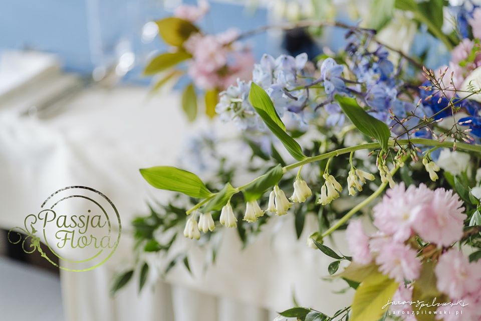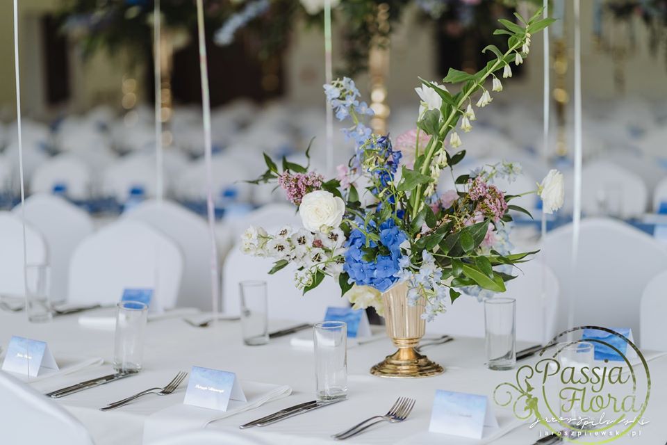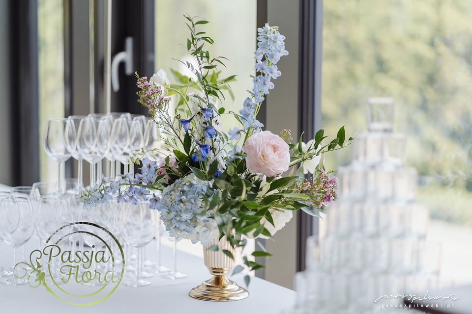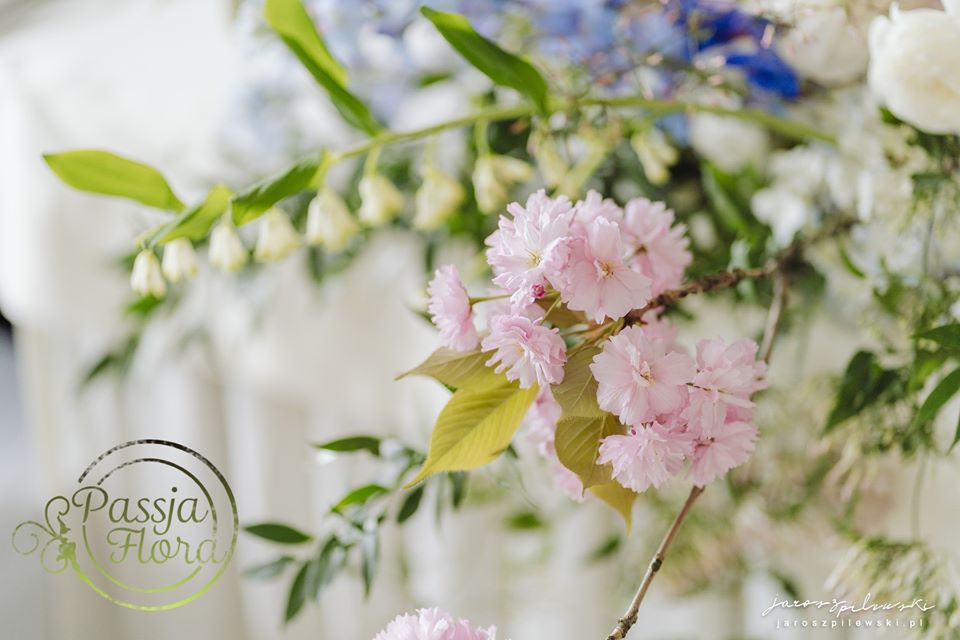 Lekko muśnięte różem. Lazurowe obrusy, złote flakony i kandelabry i ogromna ścianka pełna kwiatów z symboliczną aureolą Matki Bożej.