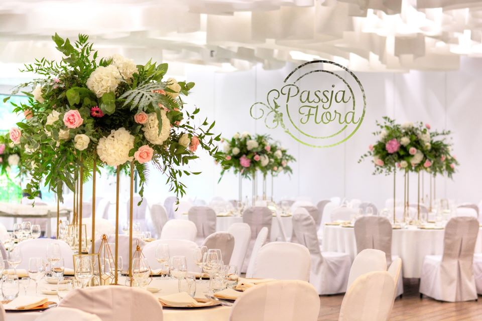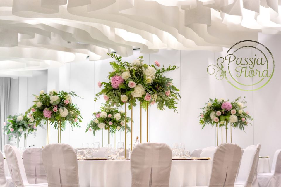 Kompozycje kwiatowe na geometrycznych stojakach.