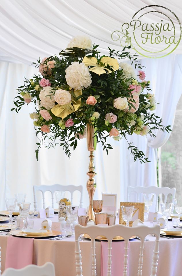 Złoto-różowe obrusy, różowe serwetki, złote podtalerze.