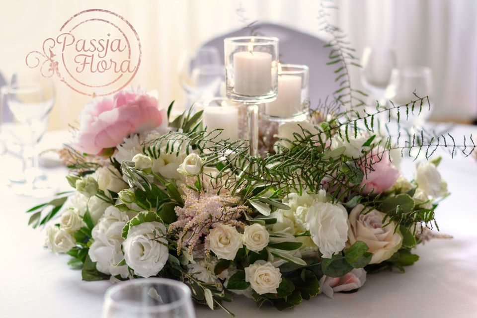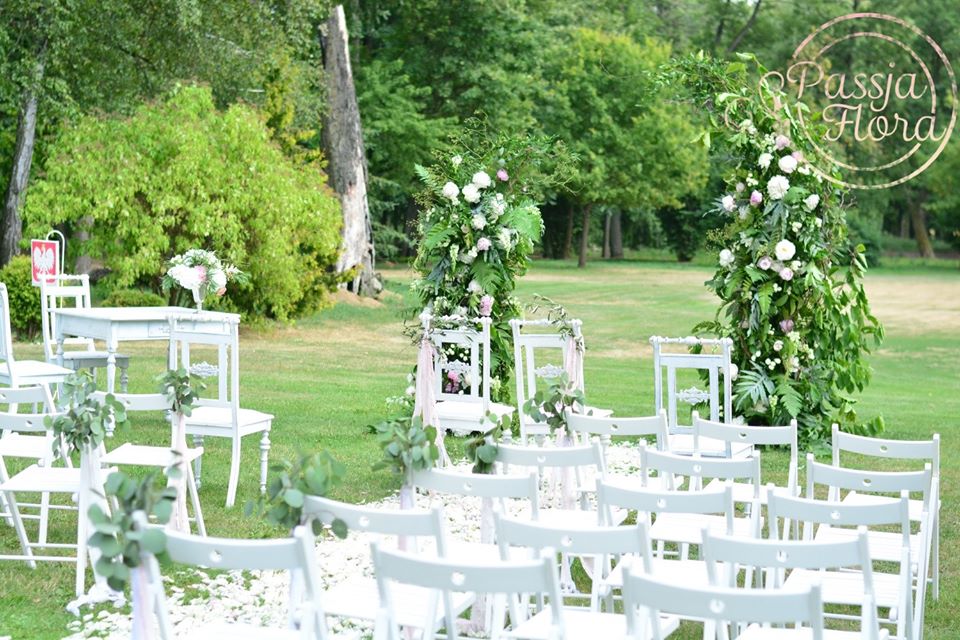 Ślub plenerowy w ogrodzie. Kwiatowe filary, białe krzesła, płatki, kwiatowe wianki, świeczniki na stołach gości.