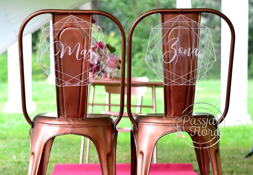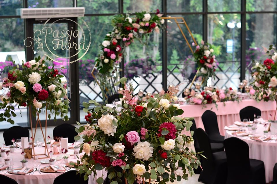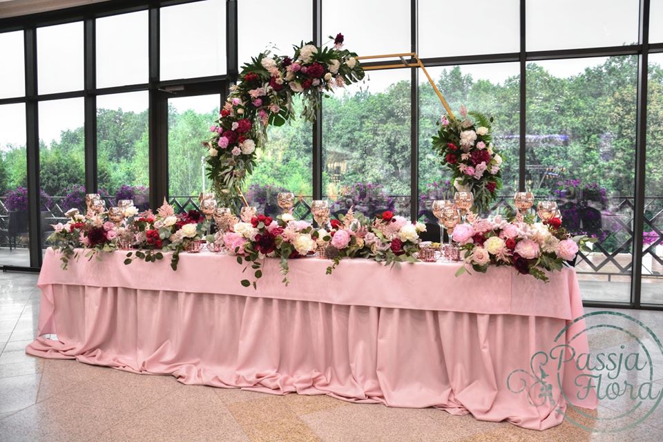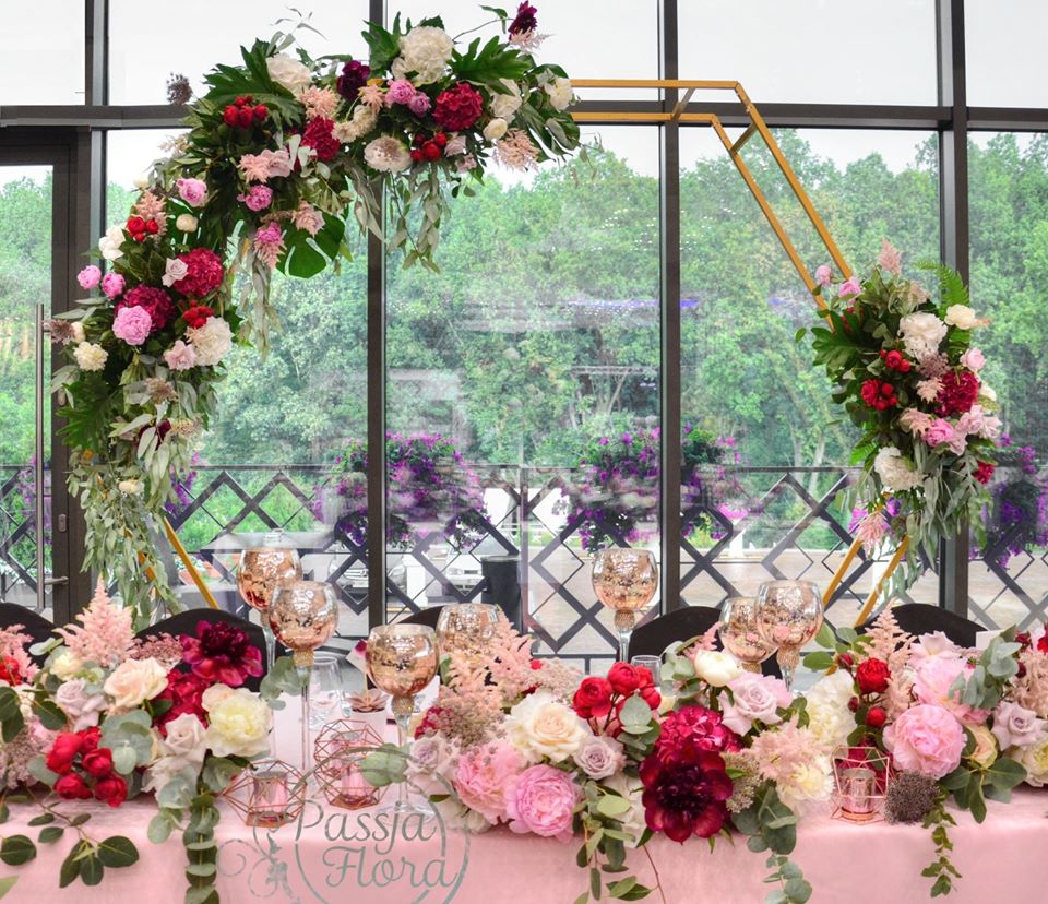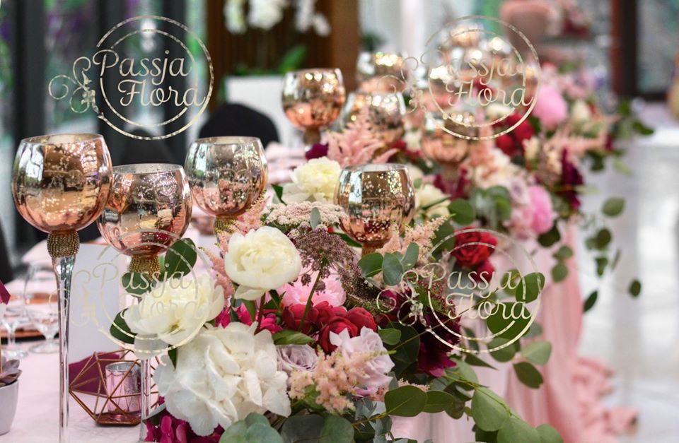 Za parą młodą kwiatowy heksagon. Na stole młodej pary miedziane, szklane kielichy na świece.