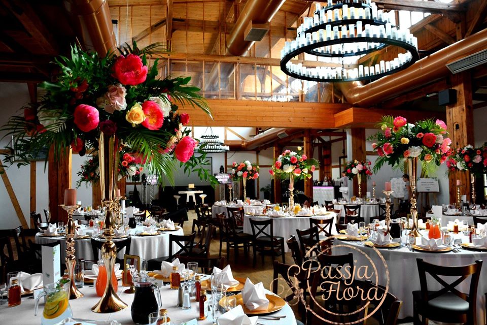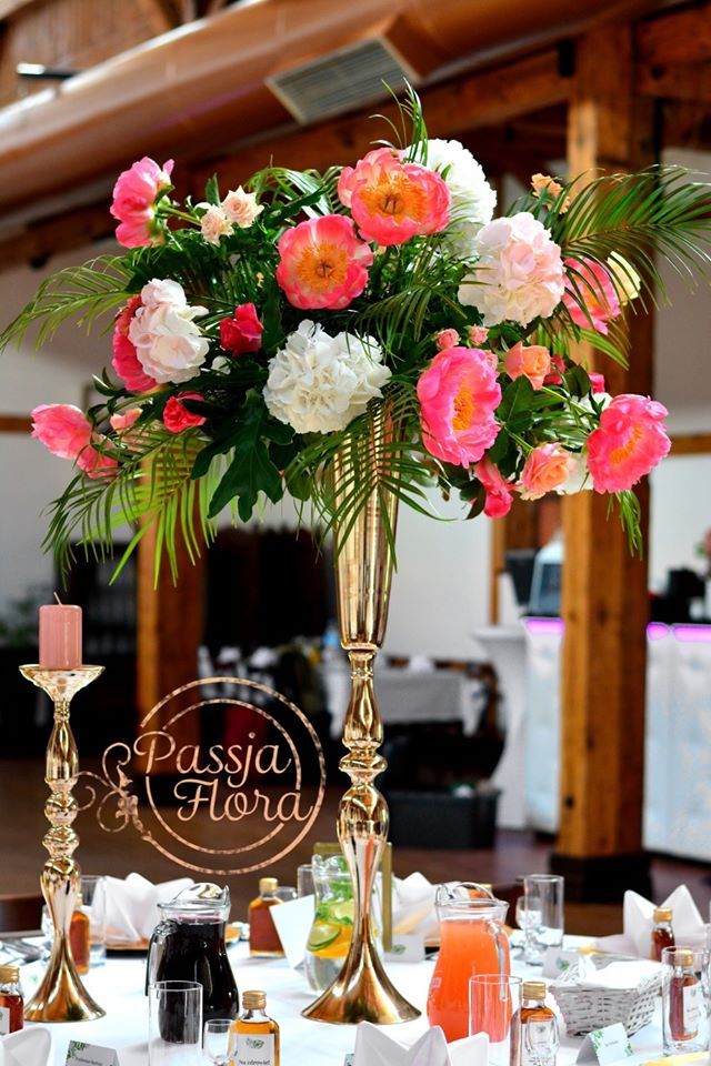 Kompozycje w złotych, eleganckich flakonach i łososiowe świece zdobią klmatyczne wnętrze.