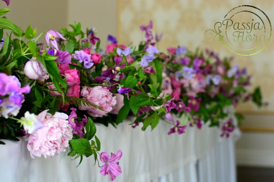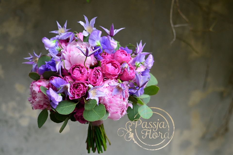 Powojniki, piwonie, hortensje, róże, fioletowe i różowe kwiaty.