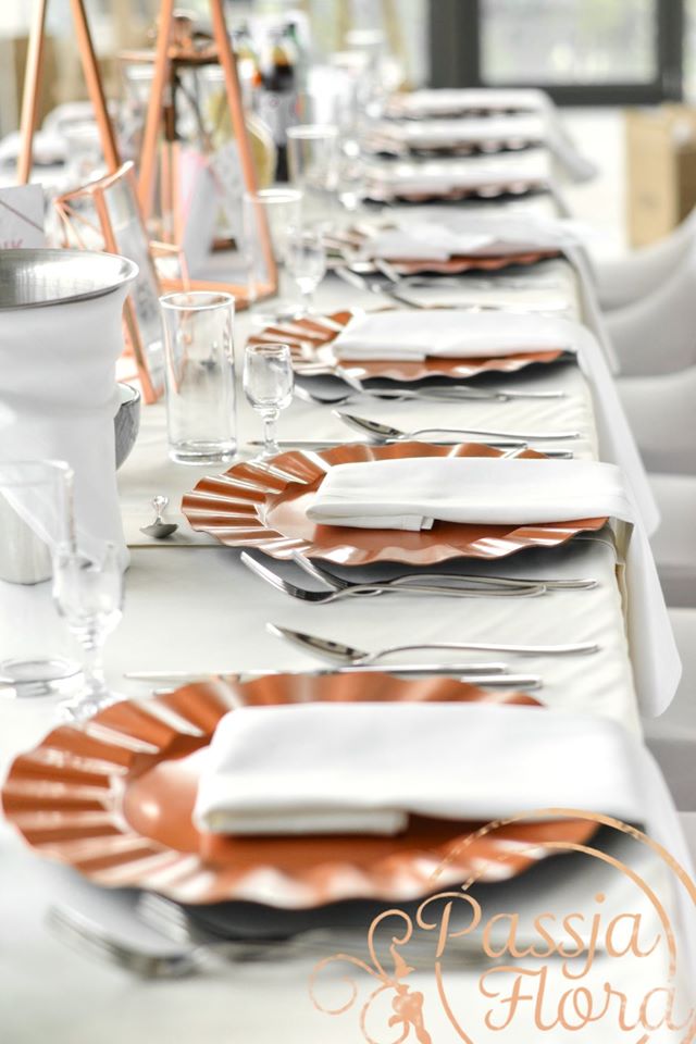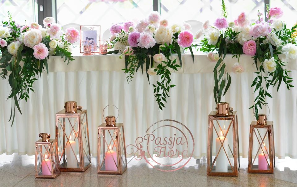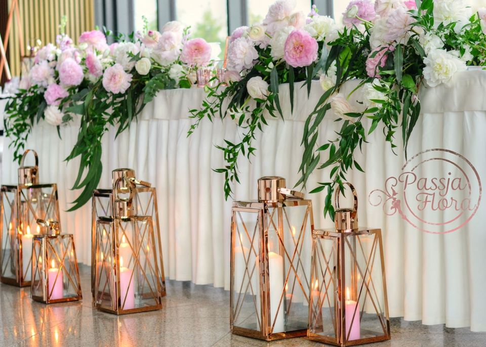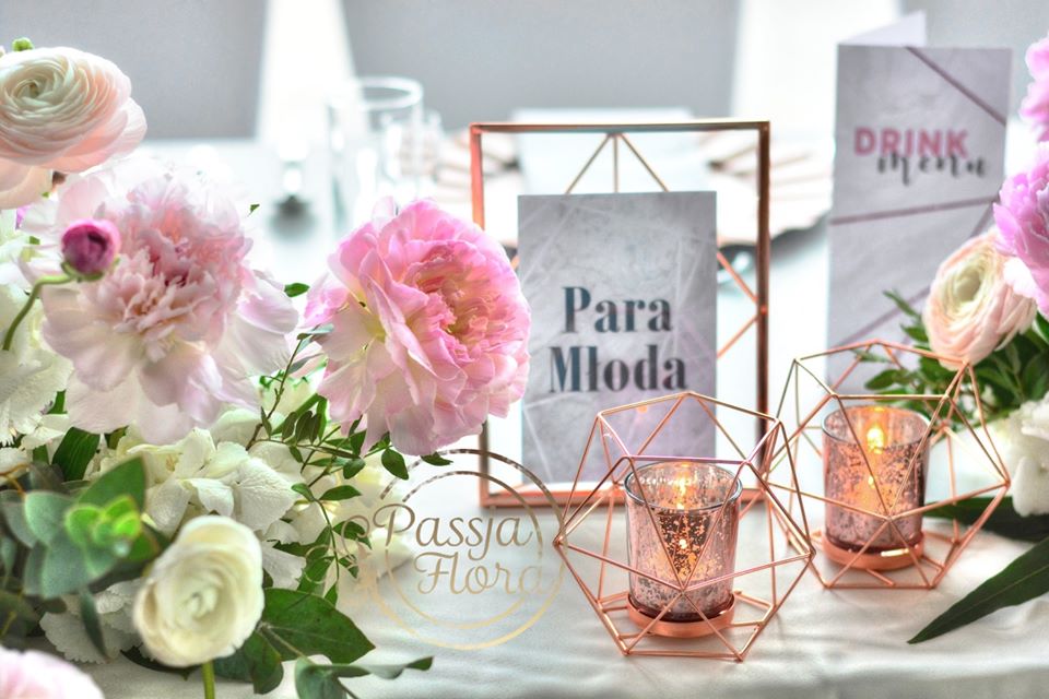 Geometryczne stojaki, świeczniki, lampiony, balony z helem, a wszystko to w modnym kolorze golden rose.