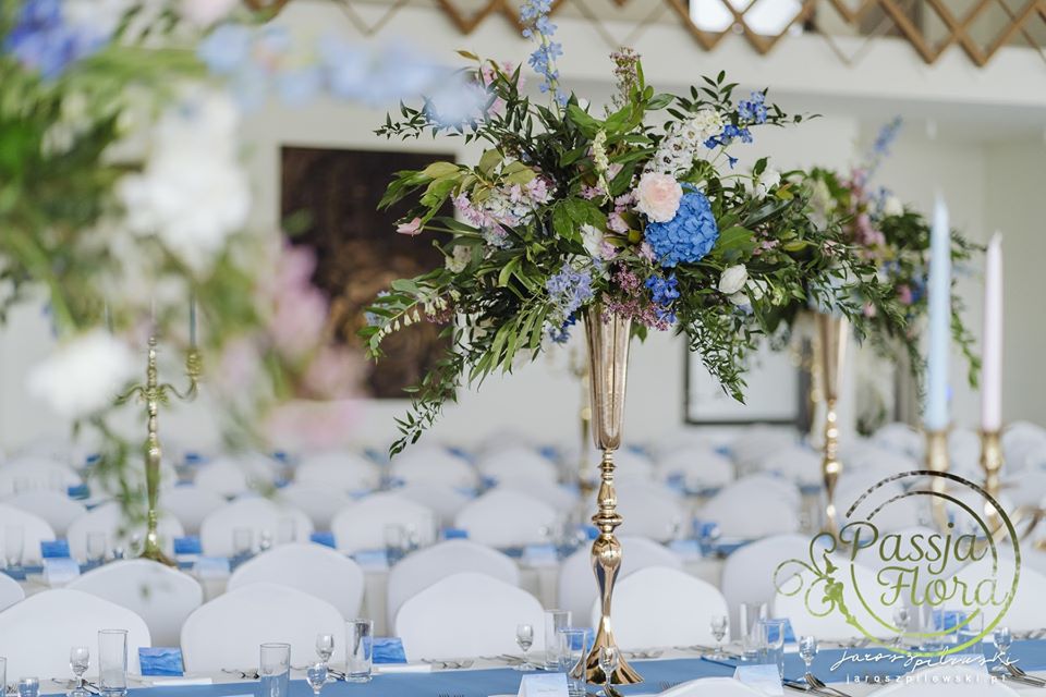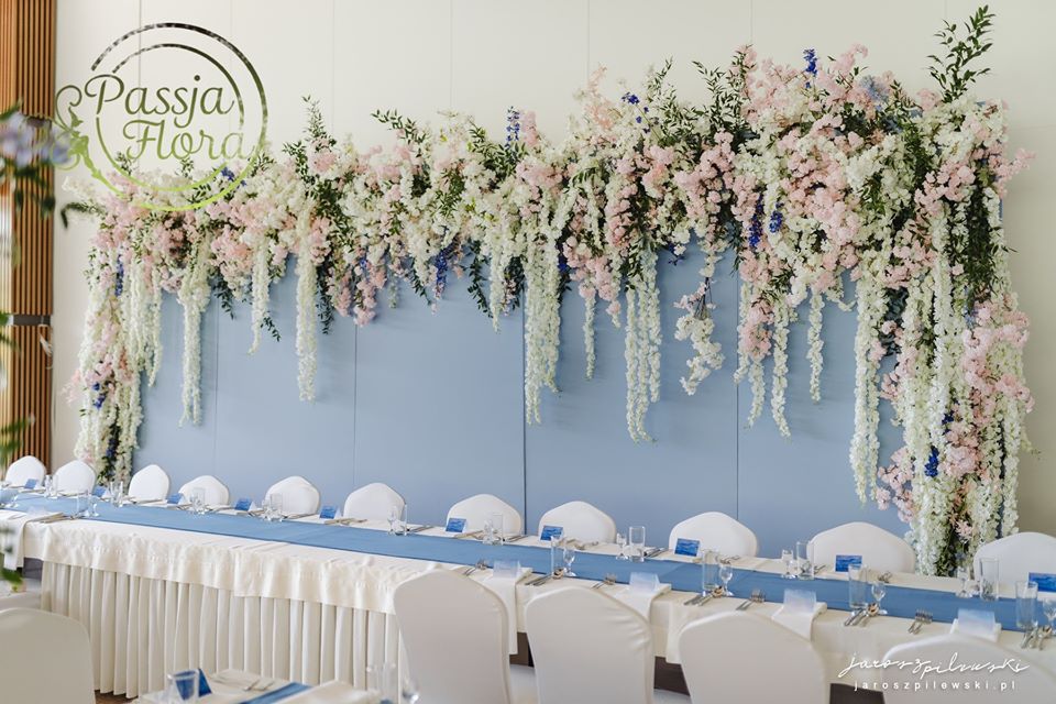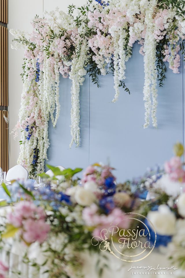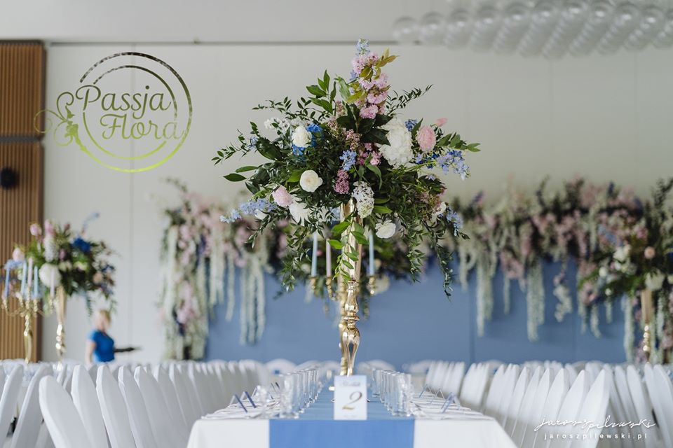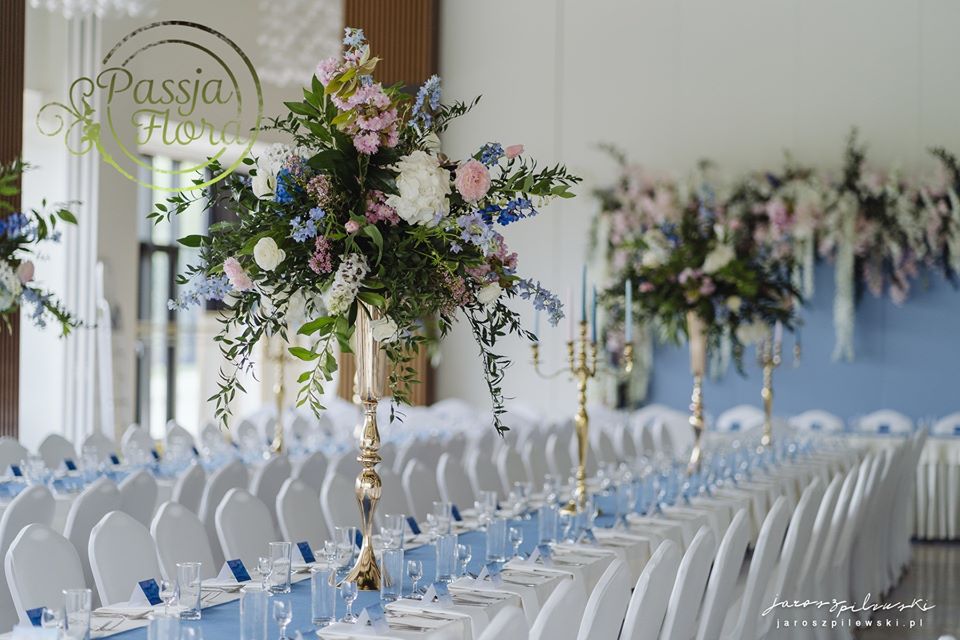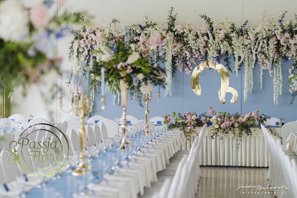 Lekko muśnięte różem. Lazurowe obrusy, złote flakony i kandelabry i ogromna ścianka pełna kwiatów z symboliczną aureolą Matki Bożej.