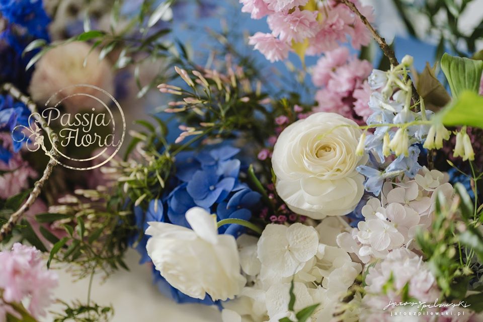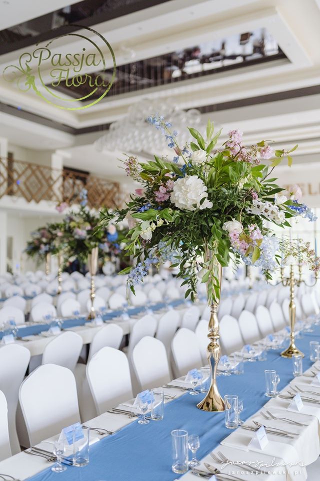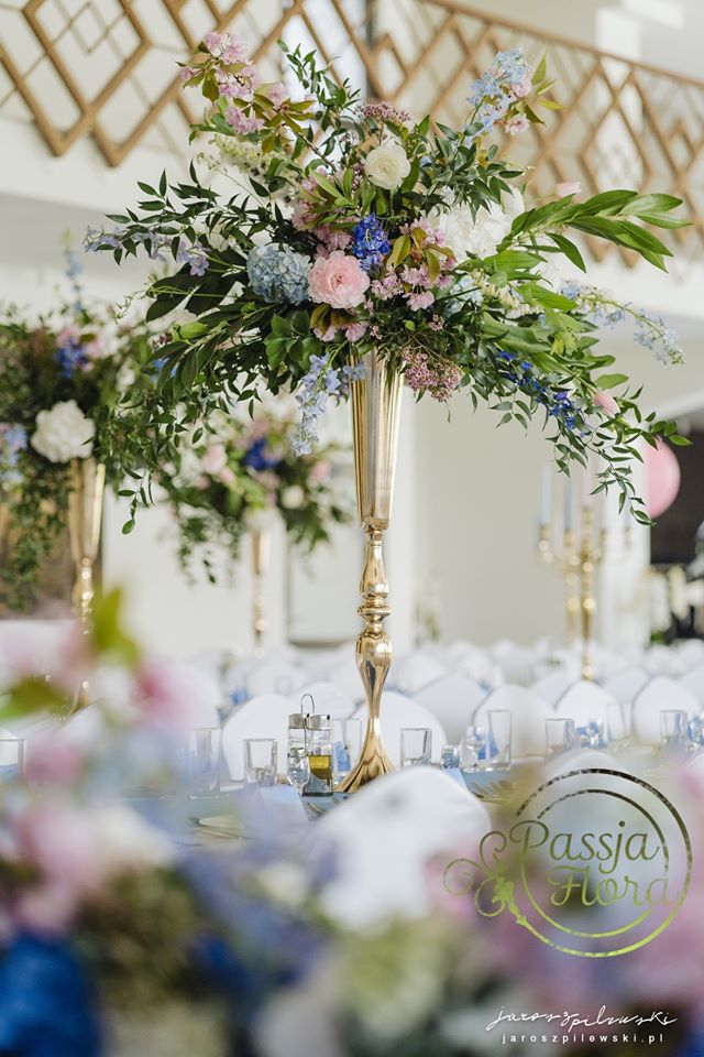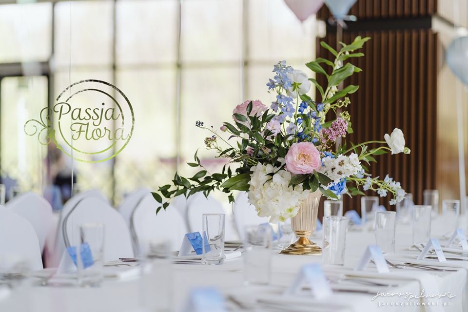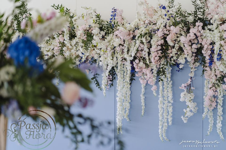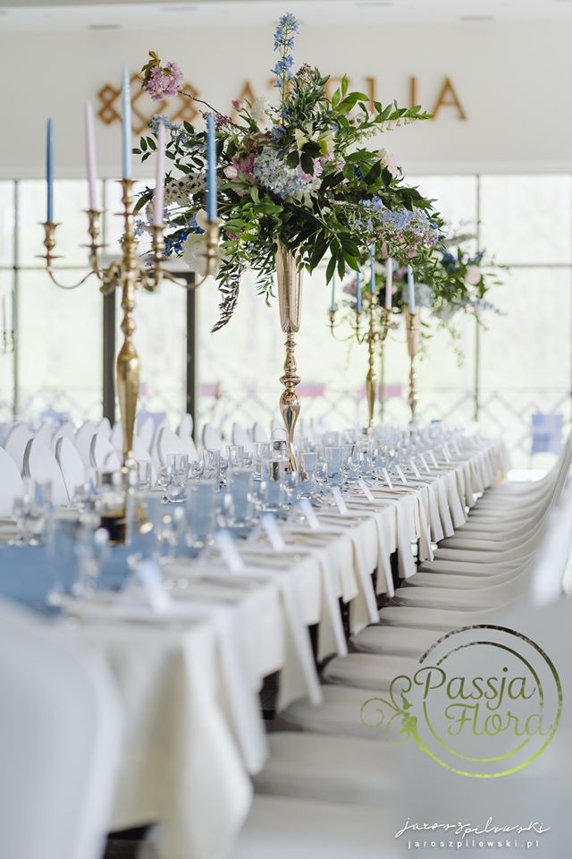 Lekko muśnięte różem. Lazurowe obrusy, złote flakony i kandelabry i ogromna ścianka pełna kwiatów z symboliczną aureolą Matki Bożej.