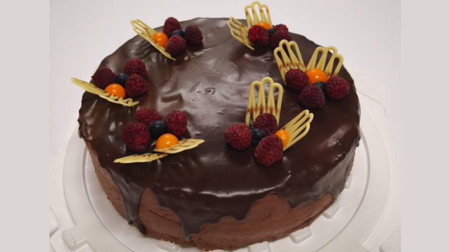 Czekoladowy z musem czekoladowym i owocami - Czekoladowy biszkopt przełożony musem czekoladowym na bazie naturalnej śmietanki z owocami do wyboru.