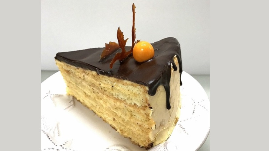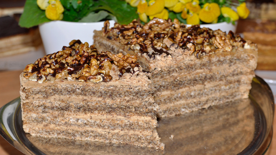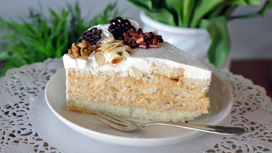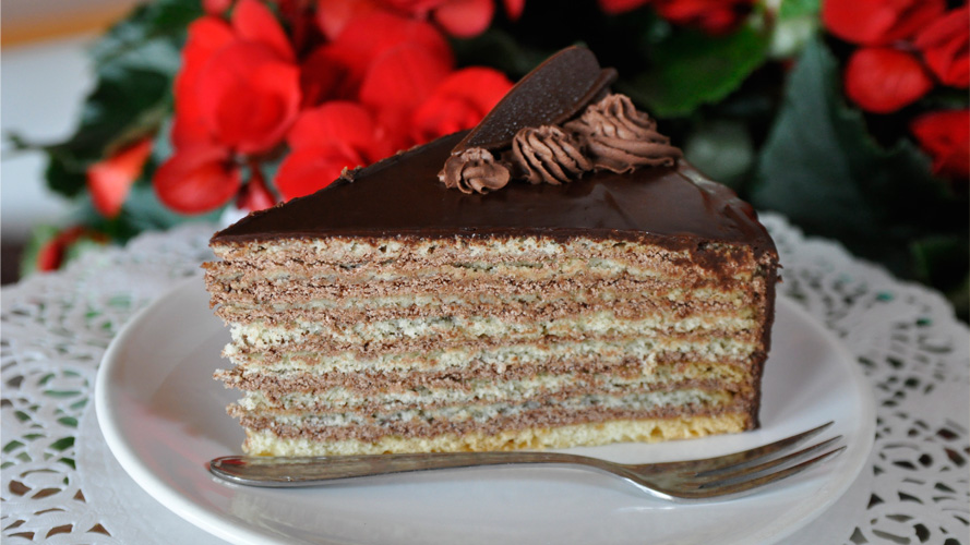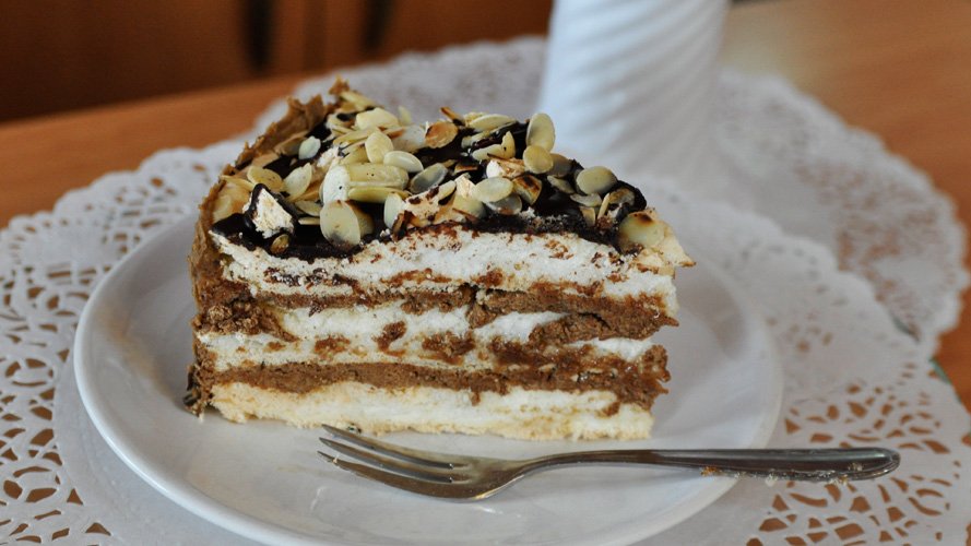 Dobosza - Tort węgierski, kilka cieniutkich płatów biszkoptowych przełożonych lekko chrupiącą masą krokantową.