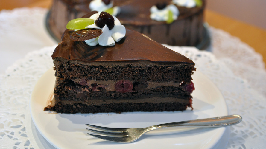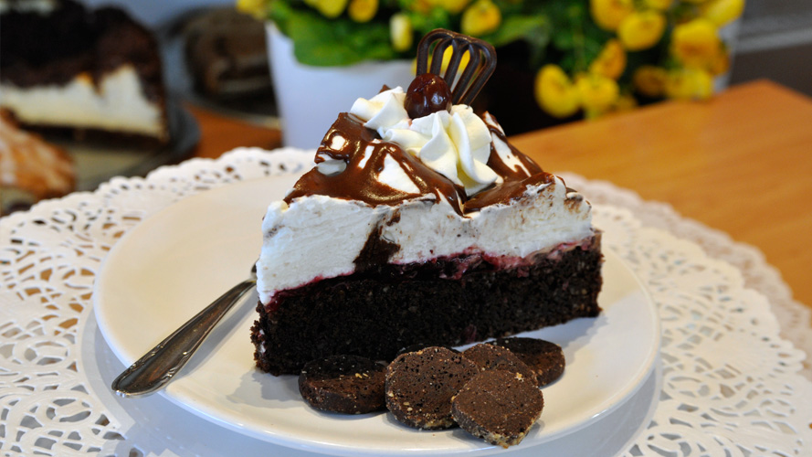 Szwardzwaldzki - Aromatyczny smak biszkoptu nasączonego wiśniówką połączony z gorzką czekoladą i wiśniami z bitą śmietaną.