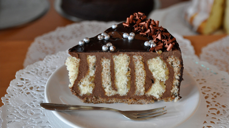 Orzechowo-czekoladowy - Czekoladowo-orzechowy biszkopt w połączeniu z ajerkoniakową masą.