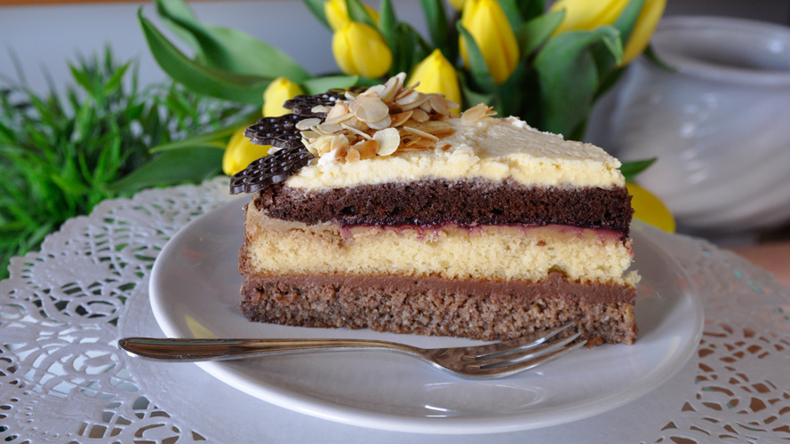 Tradycyjny - Trzy różne biszkopty (czekoladowy, orzechowy i jasny) przełożony trzema różnymi masami (kawowa, czekoladowa, cytrynowa). Do wyboru powidła: śliwkowe, morelowe, czarna porzeczka lub wiśnia.
